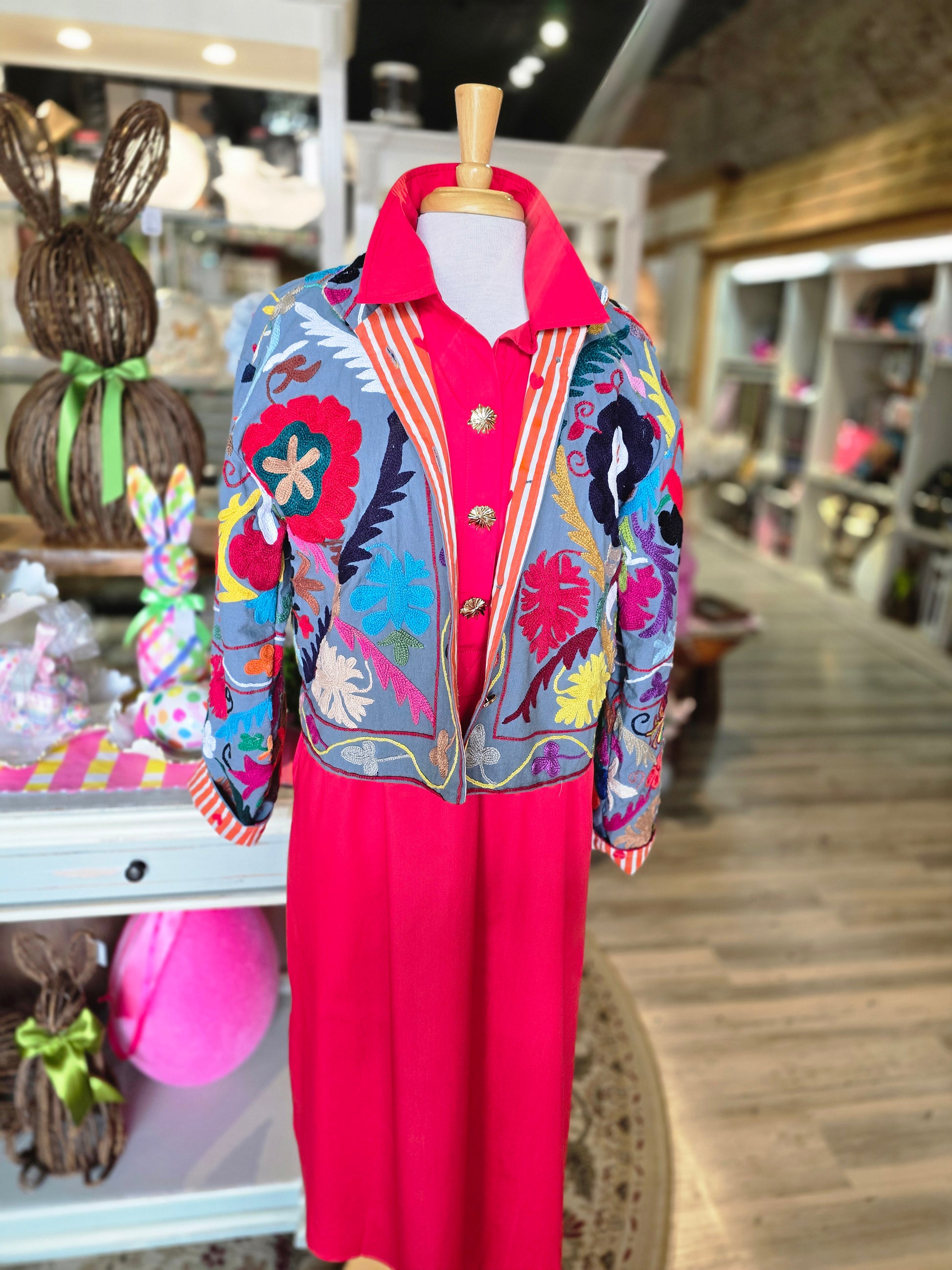 A cropped statement jacket featuring bold hand embroidery and contrast striped trim on a grey cotton base and orange heart lining. Each piece has a unique embroidery layout and color story, making every jacket one-of-a-kind.