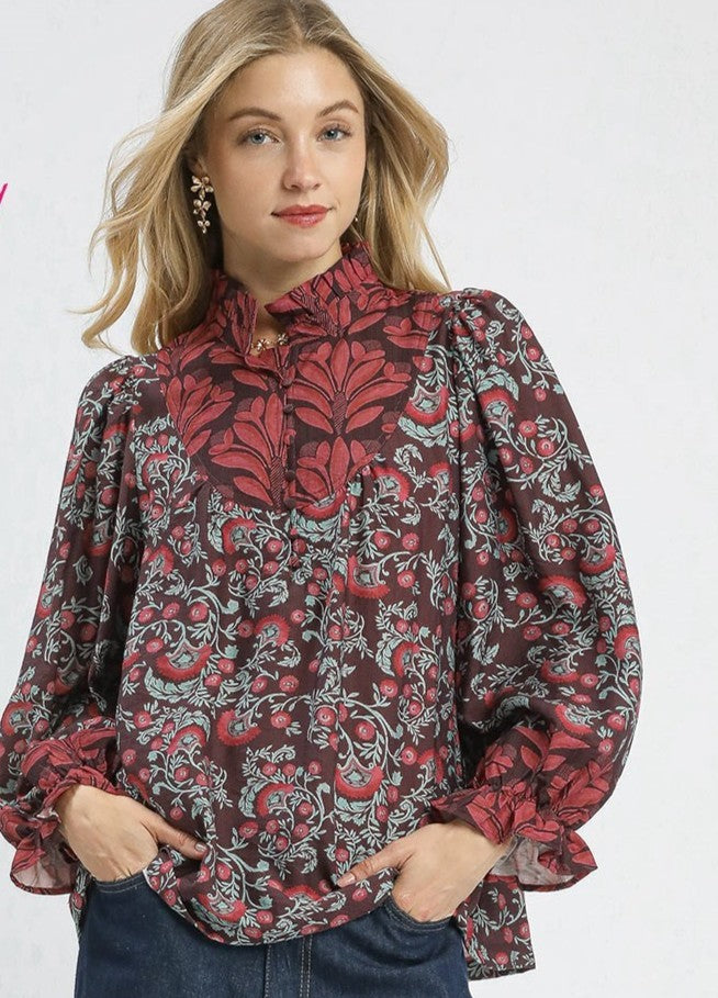 Mixed Print Ruffle Neck Top